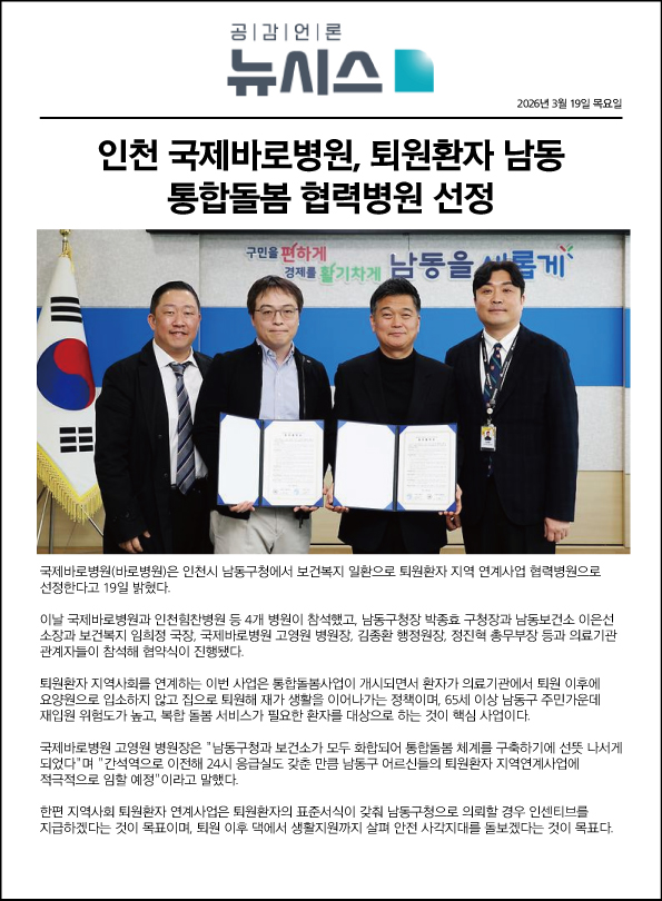 국제바로병원, 남동구 퇴원환자 지역사회 연계사업 업무협약식